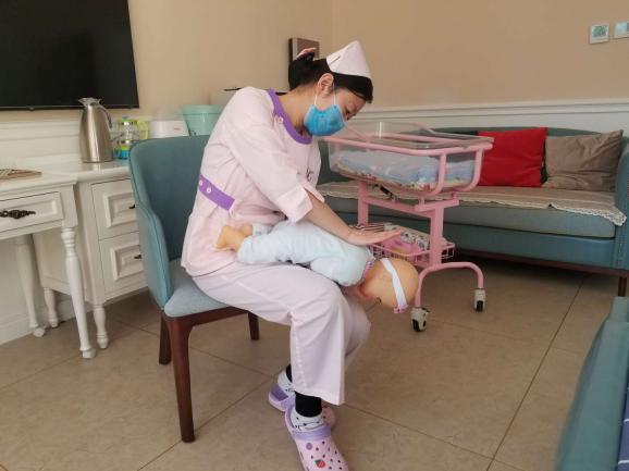 操作方法:立即將患兒取頭低腳高位,俯臥在施救者腿上,讓嬰兒上身前傾45~60度,施救者左手虎口打開、托住嬰兒下頜、打開氣道,用右手掌跟大魚際部位用力扣拍嬰兒背部4—5次,具體位置為背部肩胛骨中間,通過振動使吸入呼吸道的奶汁或痰液排出。